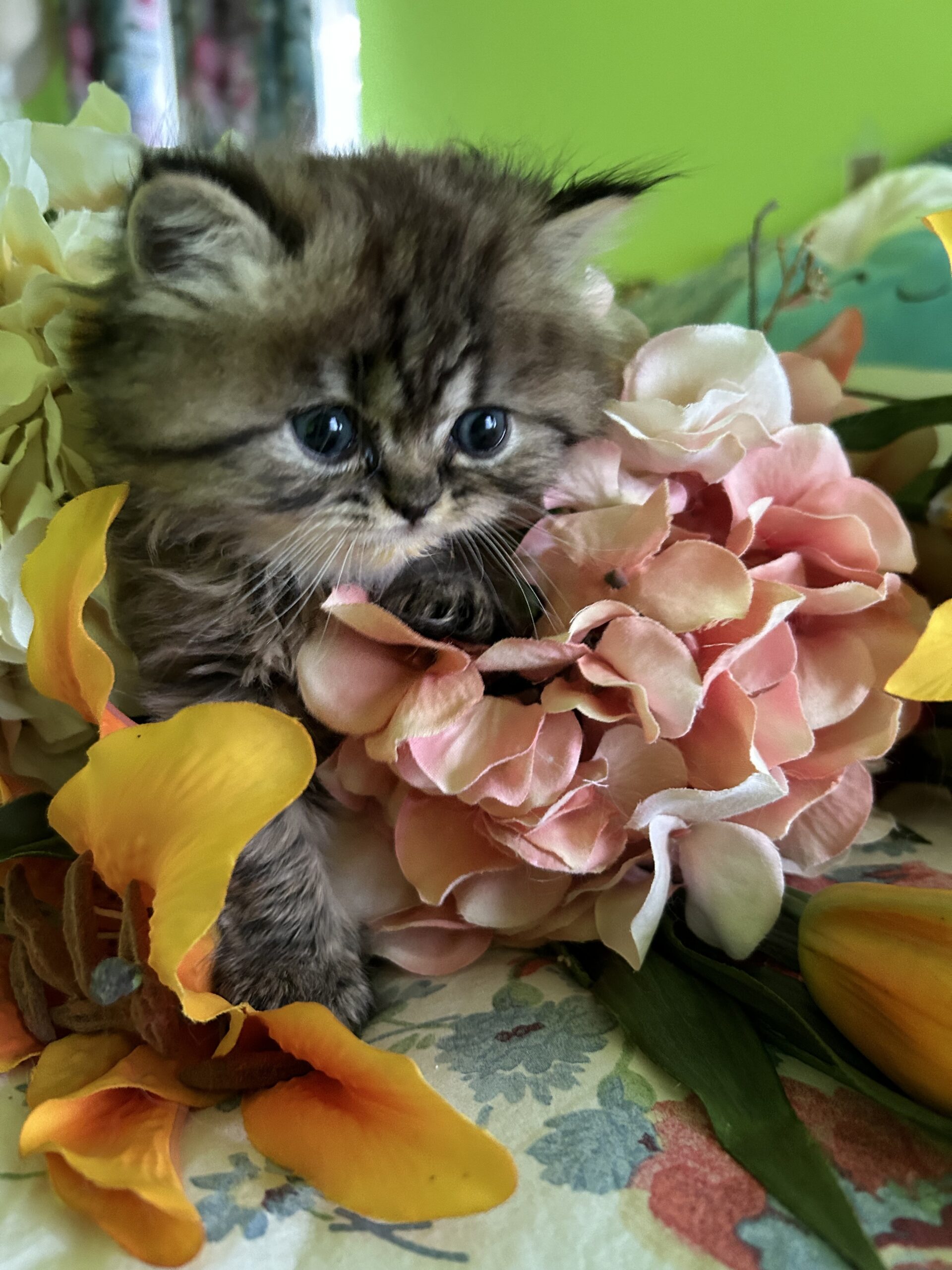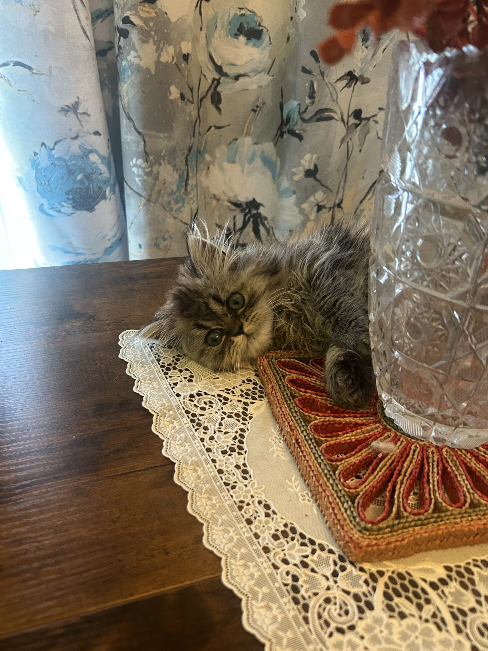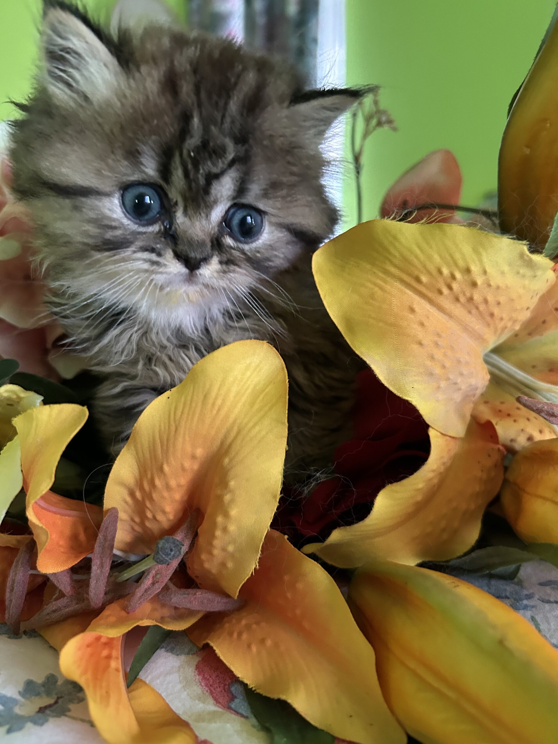 He is a male gollen shaded Chinchilla Persian Kitten With long hair. personality 2 very? and wants you to play with him or pett pet him, Loves to be hell and as soon as you pick him up he will start to purring. His bloodlines go back to Grand Champions in prestigious CAT shows.
