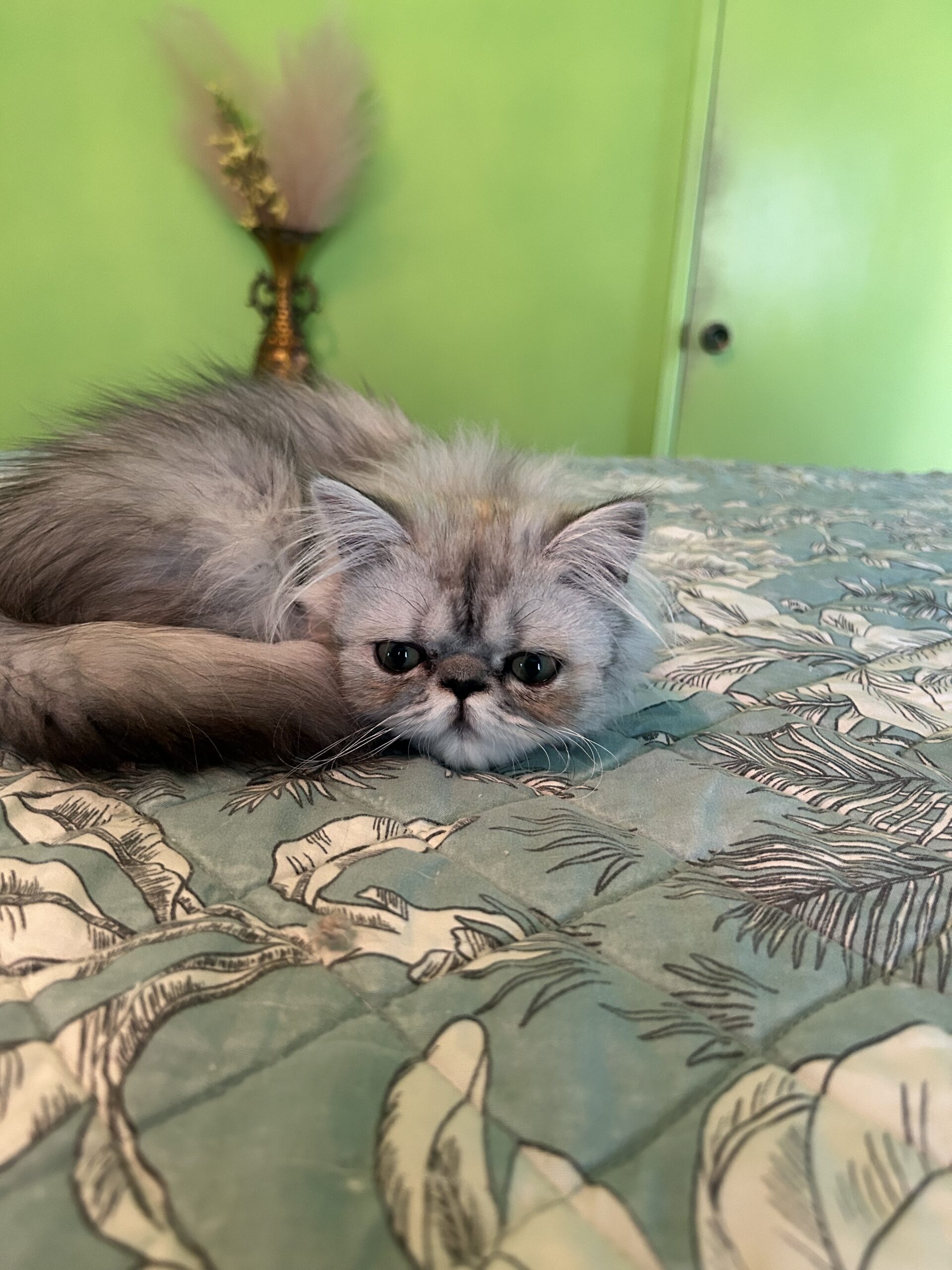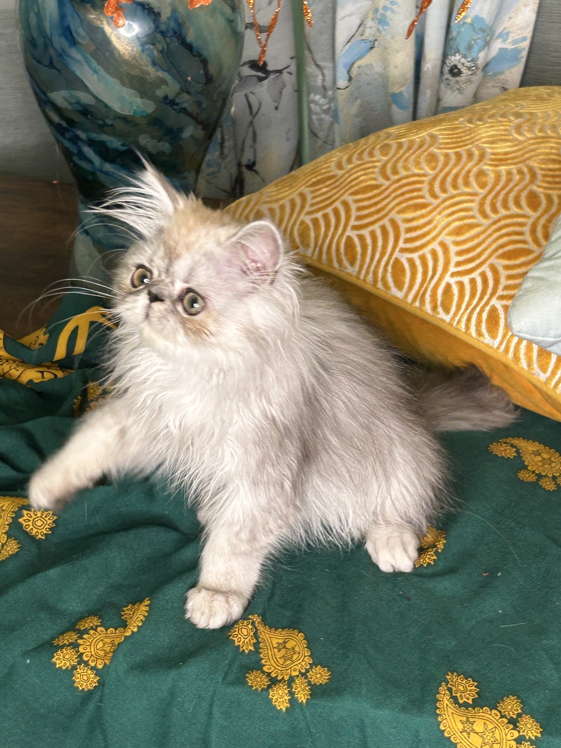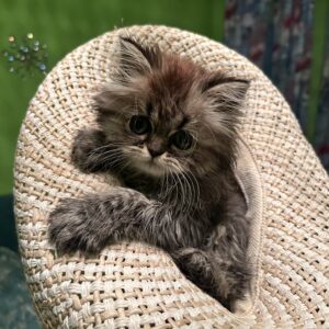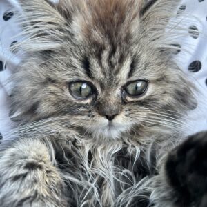 He is a white/silver Chinchilla Persian kitten with long hair. Born on March 24 2025. He is a sweet, gentle and affectionate. If you pet him, he will start purring right away. He is a Kitten that will “melt” your heart. He is CFA registered with ancestors who have won at prestigious awards at Cat Shows.