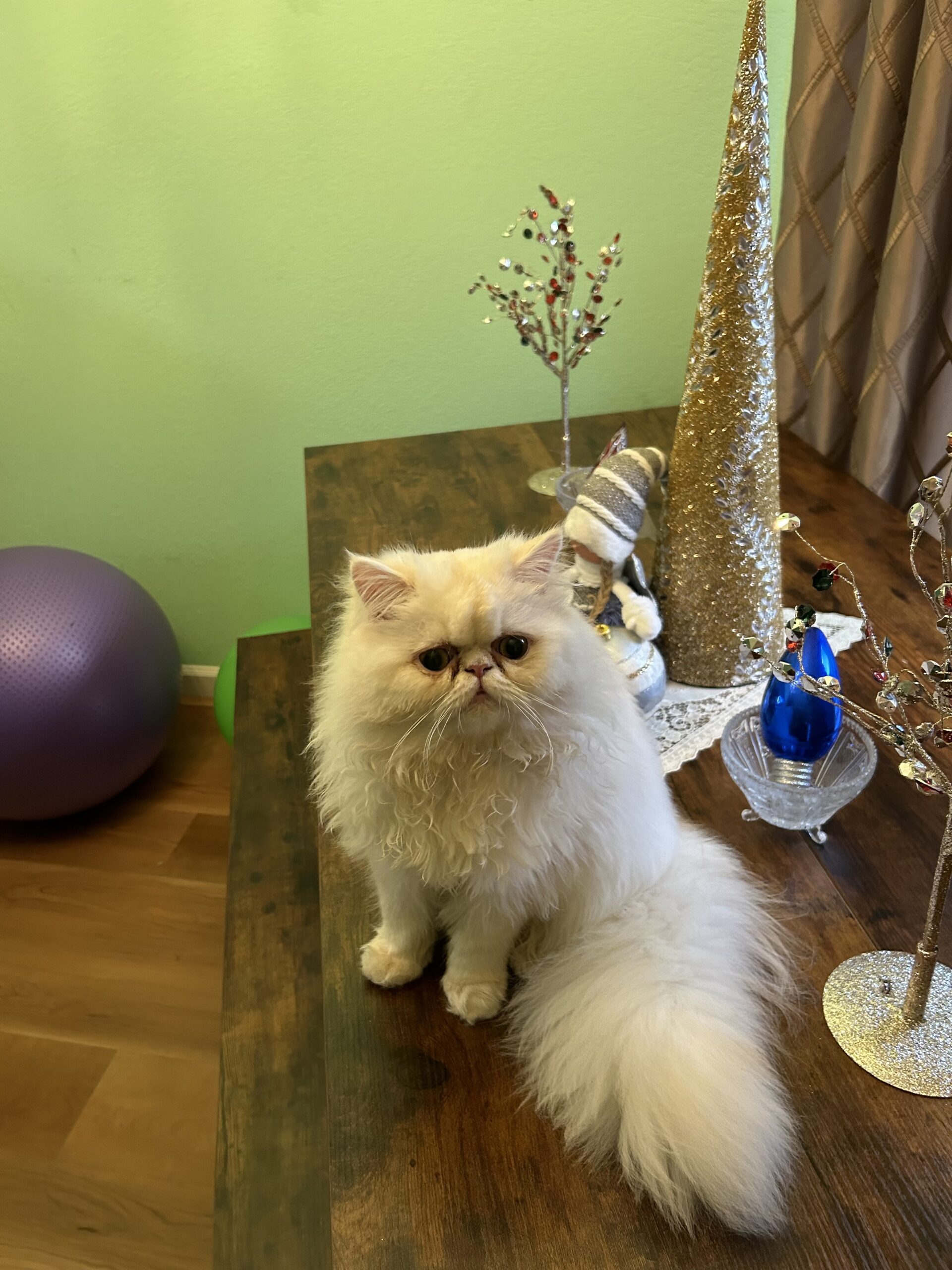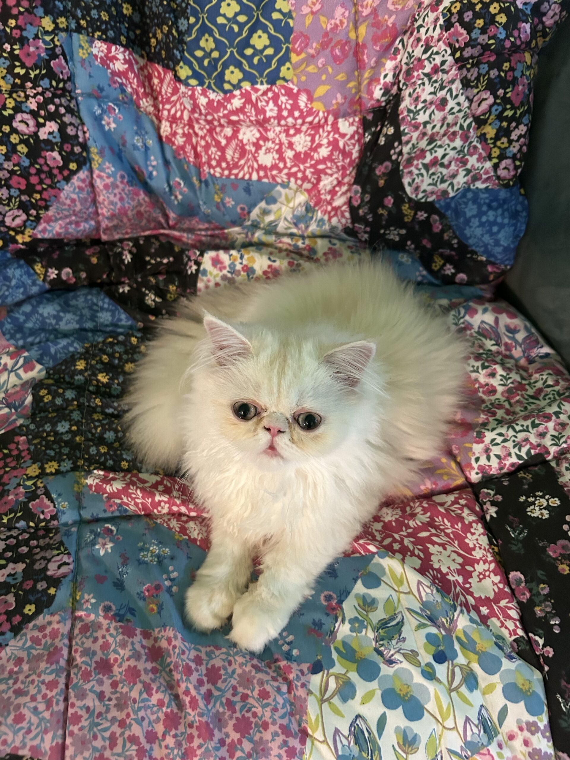 He is a white male Chinchilla Persian with Long Hair. Born on May 30, 2024. He is a very friendly cat! He will jump on your Lap and use his head to rub up against you to get some love and attention. He has a lot of energy and can really jump high. If you cannot find him you might have to check some higher places and you will be surprised where he is located. He has all his shots and has been neutered.